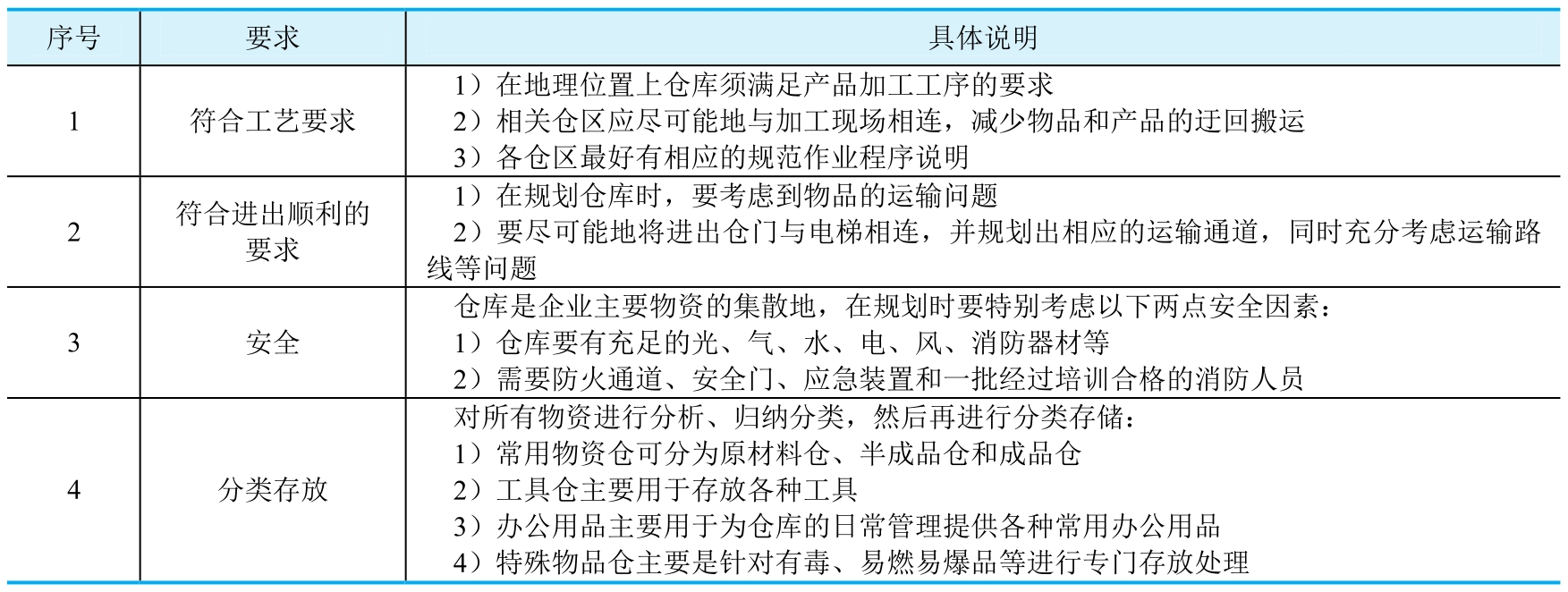 在组建、规划仓库时,应本着方便、科学的原则,应符合表2-1的要求。