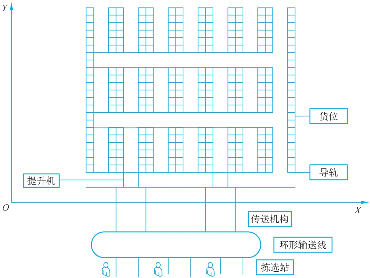 初始状态时,穿梭车在货架的最底层。穿梭车沿着巷道上的导轨到达货位前进行出库或者入库作业( Y 方向);系统中每层货架都有3个垂直于 Y 方向的巷道,穿梭车可以在这几个巷道上实现跨 Y 方向的巷道作业( X 方向);穿梭车与货物提升机相互配合作业实现跨层作业。穿梭车通过巷道上的导轨运行到货位前完成作业任务。对于出库作业任务,穿梭车在货物提升机位置卸载出库货物,出库货物通过传送机构到达环形输送线,再通过环形输送线到达对应任务的拣选站。执行入库作业任务的流程与执行出库任务的流程相反。