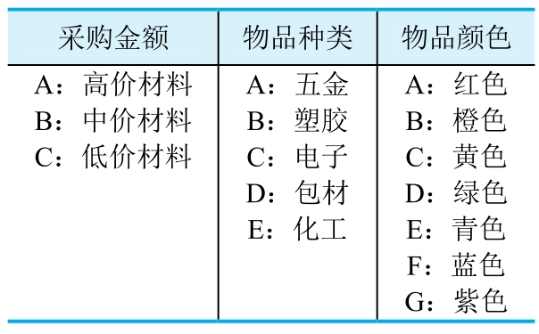 3)暗示法。暗示法是以字母或数字作为编号工具,进行物品编号的一种方法。字母或数字与物品能产生一定规律的联想,看到物品编号能联想到相应的物品,见表2-6。