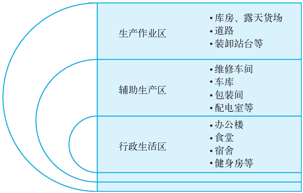 仓库总平面布置时首先进行功能分区,即根据仓库各种建筑物的性质、使用要求、运输和安全要求等,将性质相同、功能相近、联系密切、对环境要求一致的建筑物分成若干组,再结合仓库用地内外的具体条件,合理地进行功能分区,在各个区中布置相应的建筑物。大型仓库一般包含生产作业区、辅助生产区、行政生活区三大部分,仓库总体构成如图2-7所示。