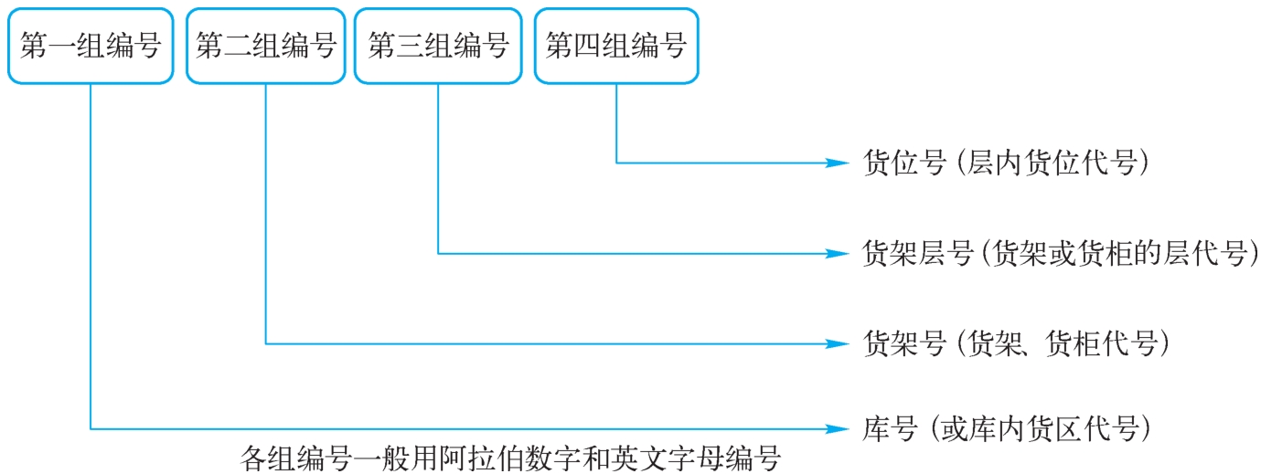 四号定位法,即库号-货架号-货架层号-货位号,编码规则如图2-16所示。