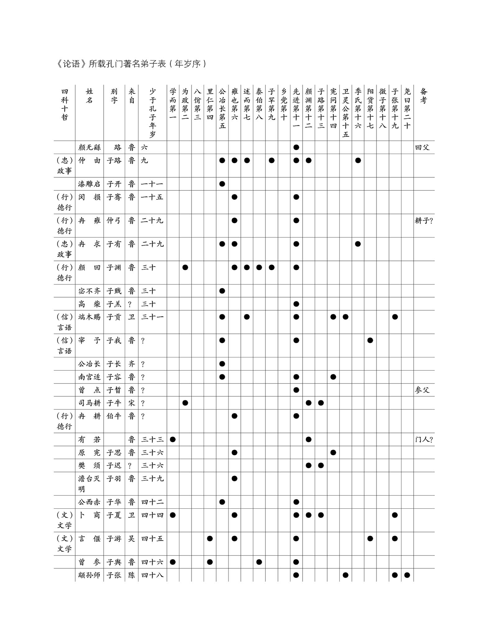 孔子一生事迹,自古以来研习多、传扬广、争论少、查考易,这里分为四阶段列成表解,简要地交代,系以可能有关的篇章——例如《为政第二》篇第四章,就是 2.4 ,如此类推。