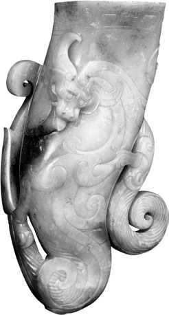 玉杯的质地为青白色的闪玉,杂有褐色斑。杯身似兽角,纹饰的处理虚实相间,布局四方呼应,具有律动感,且十分平衡和谐。