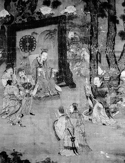 此图画法工细严谨,设色淡雅,取材于“汉殿论功”的典故,刘邦端坐于巨大屏风前,大臣们进谏、听朝,井然有序。