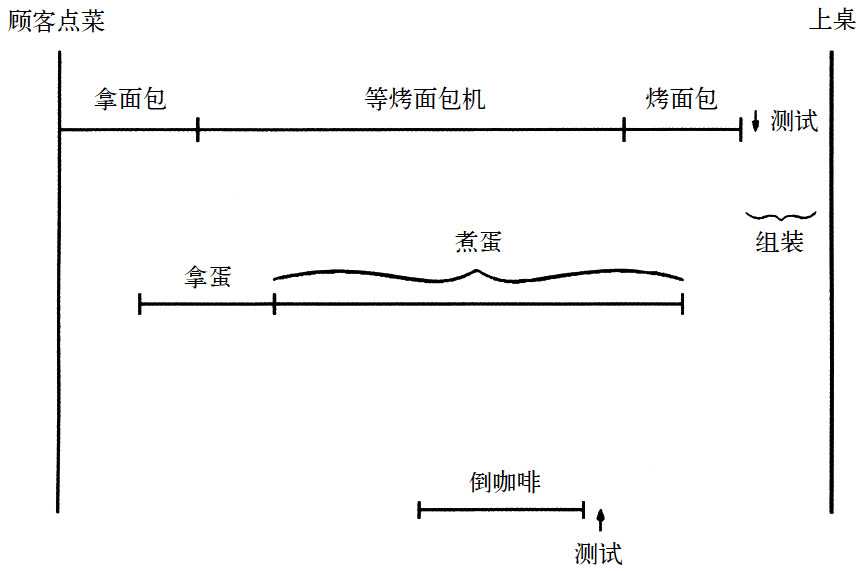 现在来看面包这一项,以煮蛋所需的时间为基准,你必须在这段时间放好面包及烤好面包;最后,以烤面包的时间为基准来决定何时倒咖啡。在此,最重要的是以需时最长(或最困难、最敏感、最昂贵)的项目为建立生产流程的基础,再以此考虑其他项目。