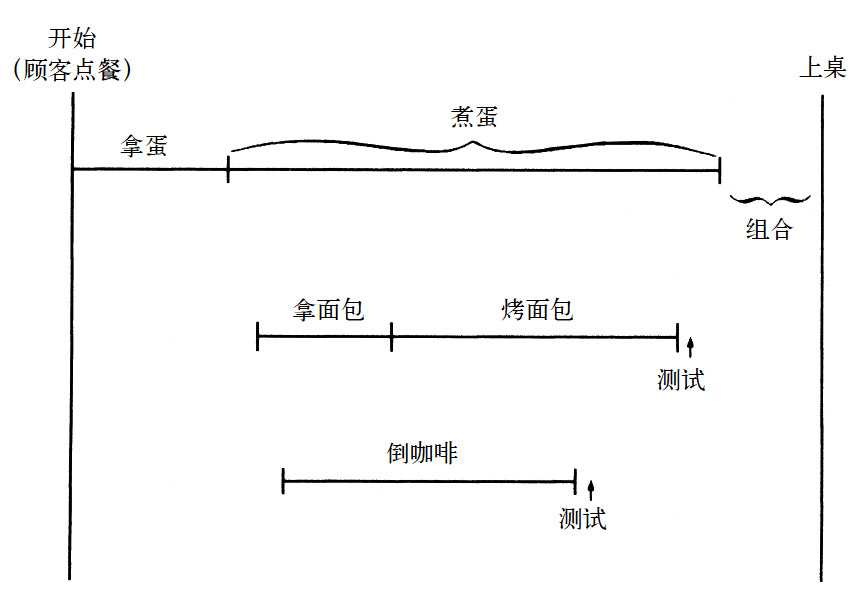 再把事情复杂化一点。万一你在该下水煮蛋时碰巧被卡在等烤面包机的长龙中,你该如何是好?乍看之下似乎没有办法,但其实不然。