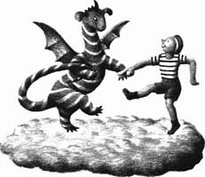 小飞龙还是个孩子,个头跟大黑熊差不多,他有一条长尾巴,身上是黄蓝相间的条纹,角、眼睛和脚掌是鲜红色的,背上还有一对金色的翅膀