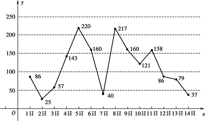 【2013年北京高考文科数学】下图是某市3月1日至14日的空气质量指数趋势图,空气质量指数小于100表示空气质量优良,空气质量指数大于200表示空气重度污染。某人随机选择3月1日至14日中的某一天到达该市,并停留2天。