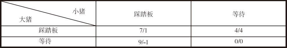 假设猪圈里有一头大猪、一头小猪,它们在同一个石槽里进食。猪圈的一头有猪食槽,另一头安装着控制猪食供应的踏板,踩一下踏板会有10个单位的猪食进槽,但是谁踩踏板就会首先付出两个单位的成本,若大猪先到槽边,大小猪吃到食物的收益比是9∶1;同时到槽边,收益比是7∶3;小猪先到槽边,大小猪收益比是6∶4。那么,在两头猪都有智慧的前提下,最终结果是小猪选择等待。