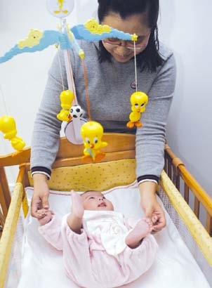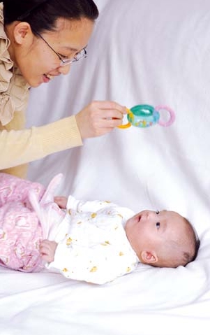 在宝宝小床上方20~30厘米处悬挂他喜欢的声响玩具,最好是会不断抖动着的,以引起宝宝的注意和兴趣。当宝宝知道注视后,妈妈可以将玩具做水平或垂直方向移动,以促使宝宝的视线随玩具移动。