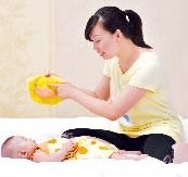 在宝宝睡醒的时候或是换尿布的时候,妈妈可以给宝宝做做按摩操。妈妈先将双手搓热,轻轻地从上至下按摩宝宝的四肢、手脚、胸腹、后背,动作要轻柔。按摩的同时可以轻唤宝宝的名字或为他念一段朗朗上口的童谣。这种按摩每天可以进行5~6次,每次3~5分钟。