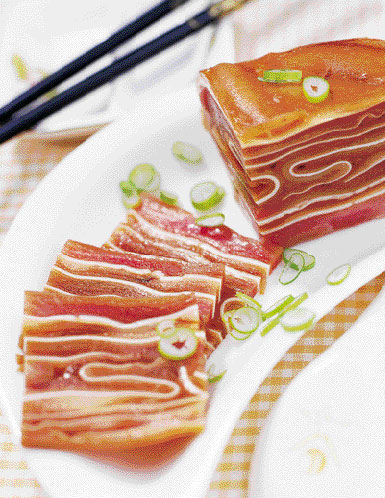 4 叠放在方盘内,浇上少许卤汁,用重物压实,放入冰箱内冷却2~3小时。即成,食用时切薄片装盘。