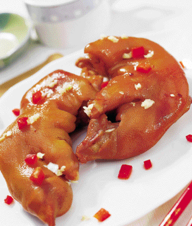 3 汤罐内加入老卤烧沸,调好口味和色泽,放入猪蹄,旺火烧沸转为小火,卤至用筷子能插进猪蹄时即可停火捞出,晾凉皮面刷一层香油或植物油即可。
