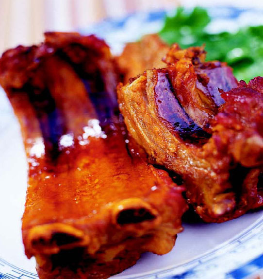 3 把酱好的排骨趁热放入熏锅内,撒入白糖熏约2~3分钟,取出即成。