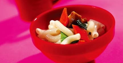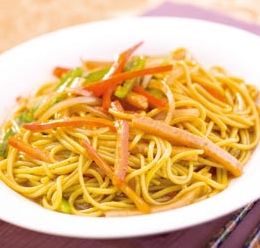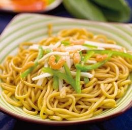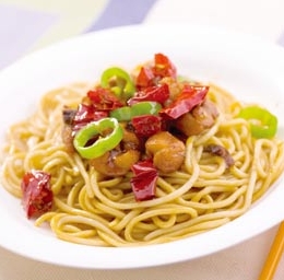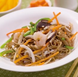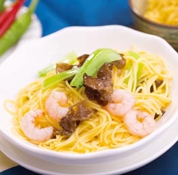 [材料] 高粱米面条200克,鸡脯肉、水发鱿鱼、虾仁各50克,水发香菇、胡萝卜、青椒各25克。鸡蛋清1个,葱末、姜末、料酒、酱油各10克,精盐、鸡精各1/2小匙,味精1/2小匙,胡椒粉0.5克,淀粉1大匙,鸡汤150克,植物油500克。