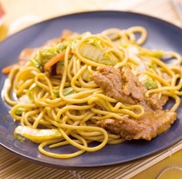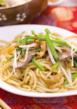 ⑤ 锅内加植物油烧热,下入牛肉丝滑炒,放入面条、葱丝、姜丝、酱油、鲜汤、白菜丝、余下的精盐炒匀,出锅装盘即成。