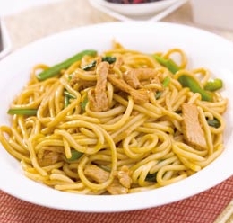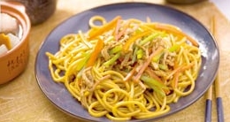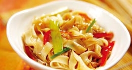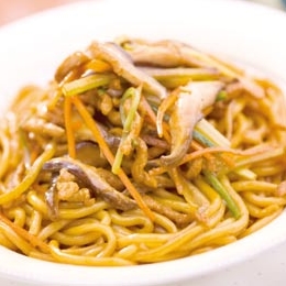 ③ 面条煮开后,捞出投凉,沥水,用油30克拌匀。锅内加油30克烧热,入面条炒散,边炒边对入炒菜的汤汁,至面条熟透,入炒好的菜、味精炒匀,出锅装盘。