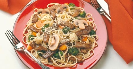 [材料] 意大利面220克,火腿丝40克,青椒丝25克,红椒丝25克,虾仁15克,鲜贝10克。洋葱丝30克,番茄酱3小匙,橄榄油2小匙,淡奶油1小匙,蒜末2小匙,精盐、黑胡椒粉各1小匙,植物油50克。