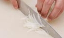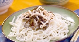 ① 取精盐1.5克化成的盐水75克,与面粉和成面团,饧10分钟,再擀成面片,切成细面条,下入开水锅中煮熟,捞出投凉,捞出沥净水。