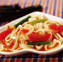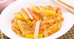 [材料] 刀切宽面条175克,菠萝、柠檬、番茄、苹果各40克。菠萝汁、番茄酱各2大匙,白糖1大匙,植物油25克。
