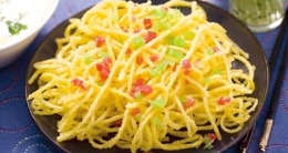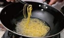 ③ 将面条拉成8扣。炒锅置旺火上,加入植物油烧至七成热时,放入面条炸至呈金黄色,捞出沥油,放在盘内。青、红丝切碎加白糖拌匀,撒在炸好的面条上即成。