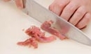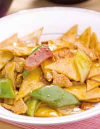 ② 腊肠、猪肉、青椒、洋葱均切成与面片大小相仿的片。