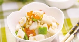 ② 明太鱼切段,沾淀粉,炸熟;桔梗煮熟切斜段;辣白菜切段;葱切圈。