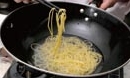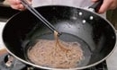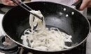 ③ 锅内加油50克烧热,刀切面条抖散,下入锅内,煎至底面微黄,翻匀。