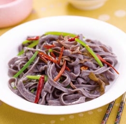 [材料] 刀切黑米面条200克,熟狗肉100克,黑木耳、青椒各25克。红干椒10克,香菜20克,料酒2小匙,酱油1小匙,醋2克,精盐3克,味精2克,鸡精、白糖各1小匙,葱丝、姜丝各10克,狗肉汤50克,植物油40克。