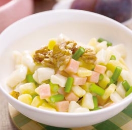 [材料] 中筋面粉200克,鸡蛋3个,熟火腿、蒜薹各30克,核桃仁25克。精盐1/2小匙,味精1/5小匙,白糖1/2小匙,葱末、姜末、蒜末各10克,湿淀粉8克,鲜汤100克,香油10克,植物油30克。