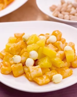 ④ 加入番茄酱翻炒均匀,下入面丁炒开,再下入菠萝丁炒匀,待汁收浓,出锅装盘即可。
