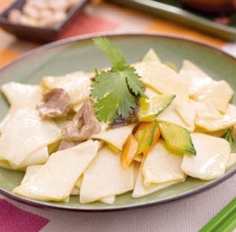 ② 猪里脊肉切成丝,用料酒1小匙、少许精盐腌渍入味,再用湿淀粉20克抓匀上浆。面团放在案板上擀成大薄片,撒面粉折叠起来,切成宽面条。