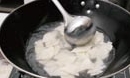 ④ 锅内加入油、花椒油烧热,下入里脊肉丝炒散,放入葱丝、姜丝炒香,加入骨头汤、酱油、余下的料酒、精盐和味精烧开。