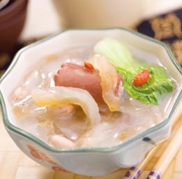 ⑤ 下入鲜汤、火腿丁、面丁、余下的精盐和白糖烧透至熟,加入味精,用湿淀粉勾芡,淋入香油,出锅装入盘内即成。