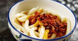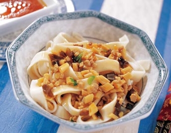 ④ 锅内加水烧沸,下入刀切面条煮至熟透,捞出面条,捞入碗内浇三鲜酱卤即成。