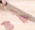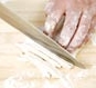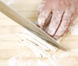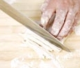 ③ 扑面粉,将面片叠一下,切成粗细合适的面条。
