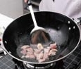 ③ 锅内放入少许植物油,烧热后放入猪肉馅煸炒至变色,加葱、姜、蒜爆香,烹料酒。