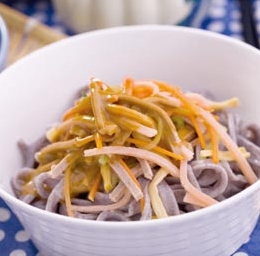 [材料] 黑米面150克,高筋面粉50克,熟鸡脯肉、熟火腿各75克,黄瓜、黄花菜、胡萝卜各30克。香菜叶5克,醋2小匙,精盐1小匙,味精1/2小匙,白糖1小匙,麻酱2大匙,蒜末20克,辣椒油、花椒油各2小匙。