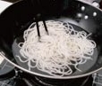 ② 锅内加水烧开,下入玉米面条,用筷子轻轻拨散,盖上盖,用中火烧开后,点入凉水,盖上盖,再沸时,捞出沥净水,放入碗内。