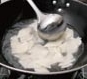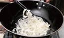 ③ 锅中放入油加热,把葱放入爆炒一下,入虾仁、香菇翻炒,加入调味料翻炒均匀成卤出勺备用。