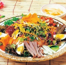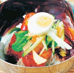 [材料] 中筋面粉500克,酱牛肉50克,雪梨50克,紫生菜50克,小白菜50克,红椒40克,熟鸡蛋1个,木瓜30克,紫甘蓝40克。辣酱40克,精盐1小匙,味精、鸡精各1大匙,醋2大匙,白糖、大蒜、芝麻、香油各2小匙,植物油、胡萝卜各20克。