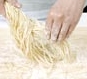 ① 黑米面内加入高筋面粉、精盐1/4小匙、适量水和成面团,略饧,擀制成面条。