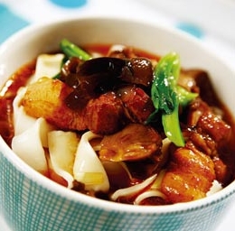 [材料] 宽条面200克,红烧肉250克,黑木耳、香菇、菜心各20克。鲜汤720克,酱油、料酒各1大匙,精盐、味精、白糖各2/5小匙,葱段、姜片各1小匙,植物油1/2大匙。