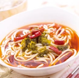 ⑤ 放入精盐、酱油、花椒水、味精、油菜丝、香油调匀,浇在面条上即成。