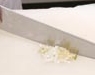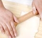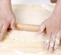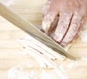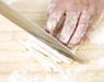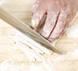 ④ 在面粉内加精盐1/4小匙,用凉水和成硬面团。揉匀后擀成大薄片,撒面粉,折叠后切成0.8厘米宽的面条。