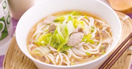 ① 将面粉放入盆内,加适量水和好,制成面条;猪肉洗净切丝;白菜心洗净切成小段。