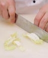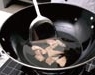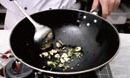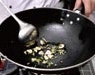 ③ 炒锅上火烧热,入油,放入葱末、姜末炝锅,烹料酒,再下入鲜汤和调味料。