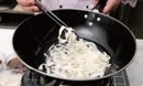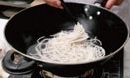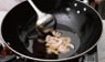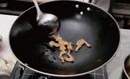 ③ 炒锅上火烧热,加油,放入肉丝,香菇和调味料煸炒,再下入葱,姜丝爆香,添鲜汤。