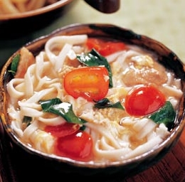[材料] 中筋面粉400克,鸡蛋2个,香菇、葱、虾仁、番茄各20克,玉米笋尖15克。精盐1大匙,味精1/2小匙、鸡精1大匙,香油1大匙,植物油50克。