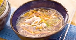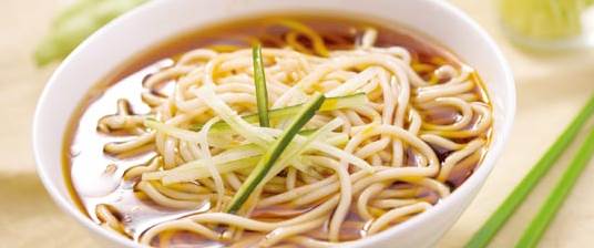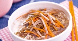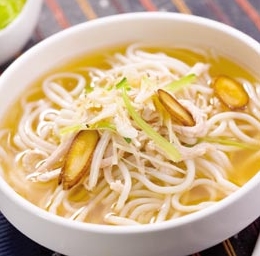 [材料] 高粱米面条200克,鸡脯肉100克,水发香菇、胡萝卜、青菜各25克。葱丝、姜丝、料酒、酱油各2小匙,精盐1/2小匙,味精、鸡精各2克,鸡汤500克,植物油2大匙。